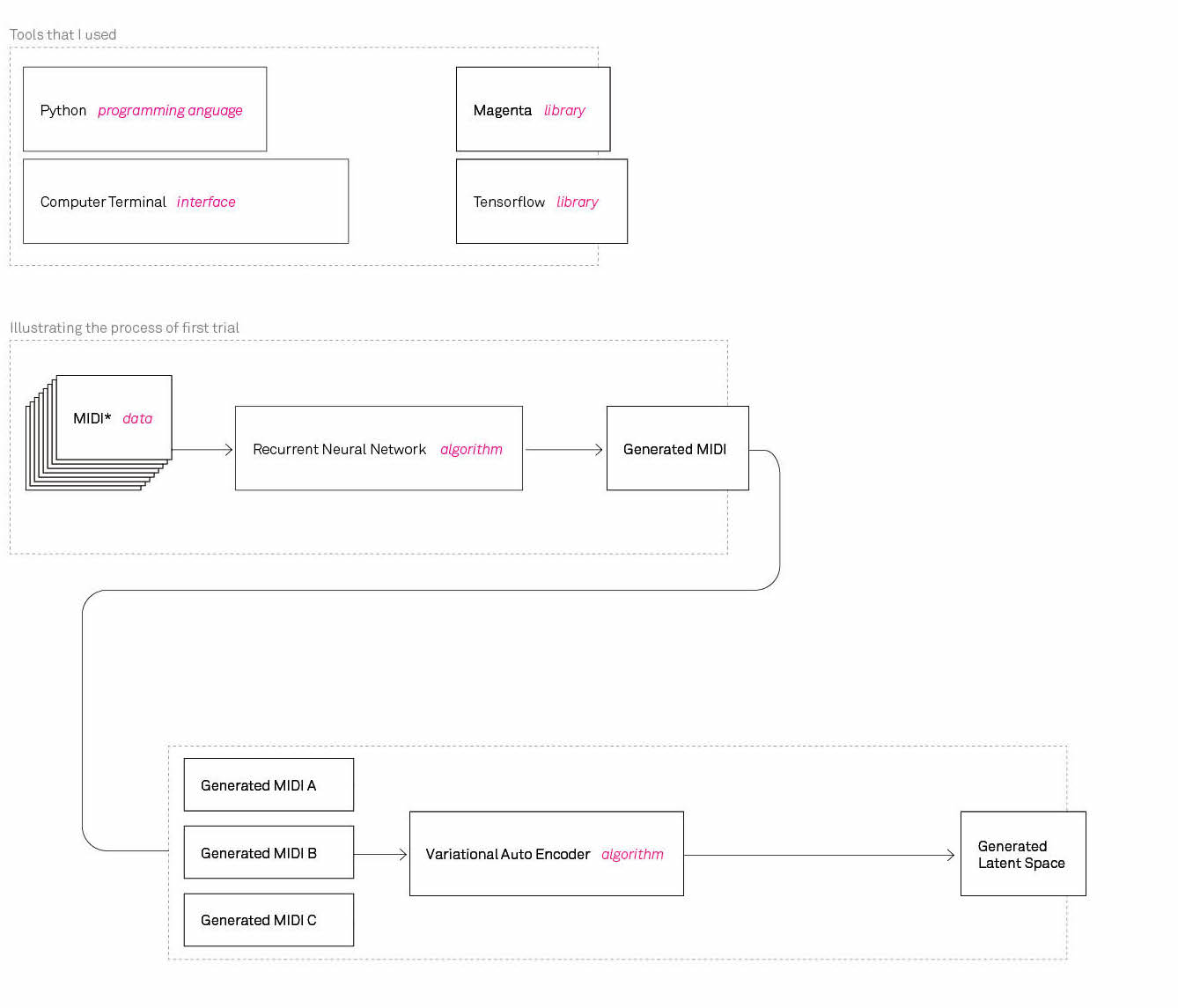 After having spent a considerable amount to understand the theory behind both musical structures and musicology, I tried to understand which library I can use to train MIDI sound files for specific algorithms. [Magenta] is distributed as an open source Python library, powered by [TensorFlow] . This library includes utilities for manipulating source data (primarily music and images), using this data to train machine learning models, and finally generating new content from these models. Below I introduce two machine learning approaches for different purposes. On the right I attempted to visualize the process of my two approaches.